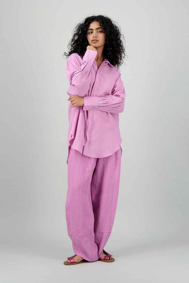 Jade Kimono Pants – Flowing wide-leg pants designed with a high waist and kimono-style cut, offering graceful movement and a timeless shape. The long length adds elegance, while the matching pink tone completes the cohesive look.