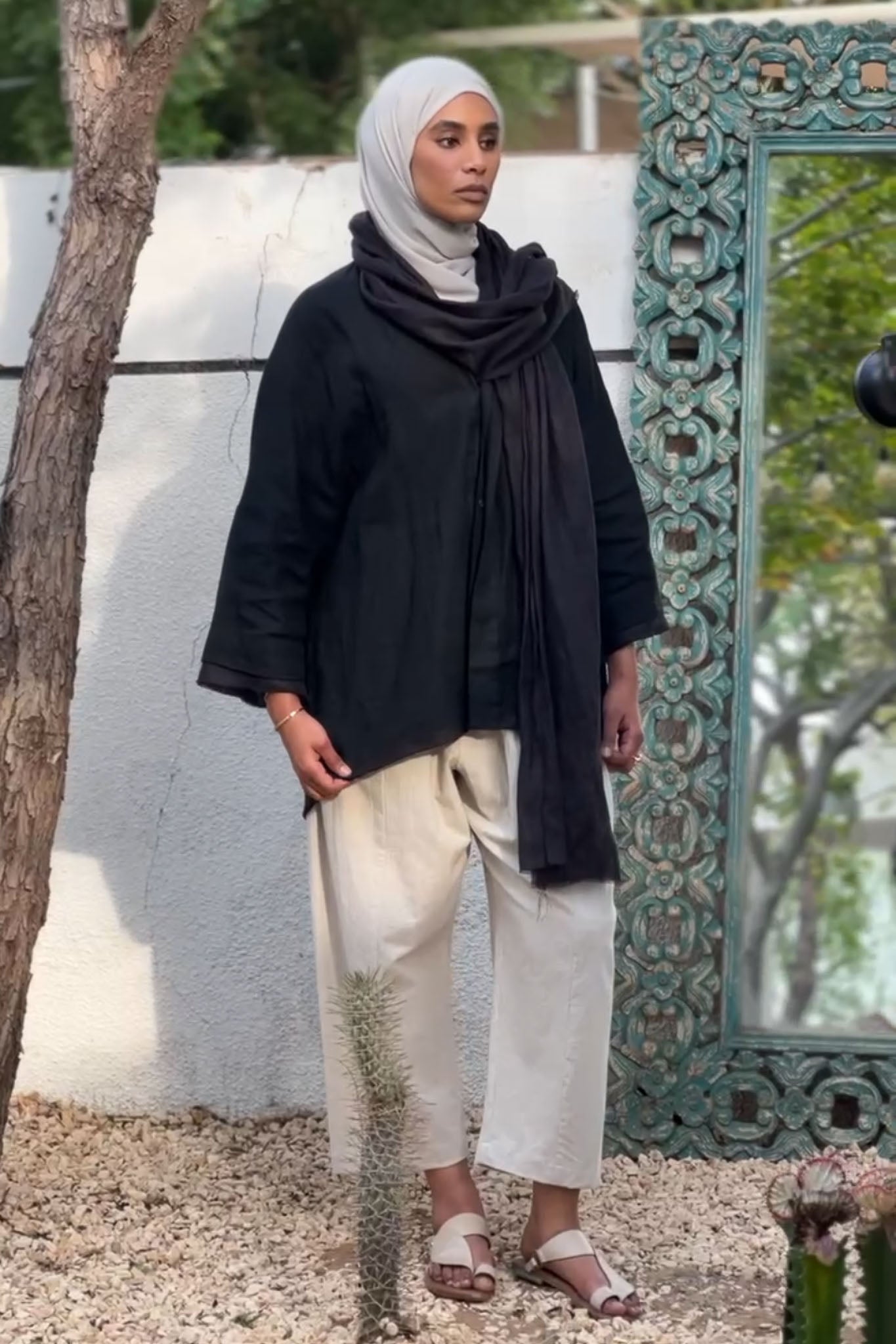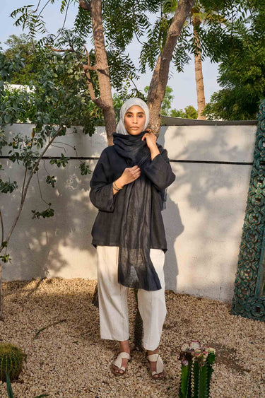 Our bestselling Mika 2 unisex one-size shirt returns in a new edition, now featuring an attached gauze linen scarf for added versatility. Designed to adapt effortlessly from a morning coffee with a friend to an evening out.